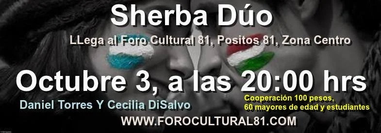 Sherba Dúo, Daniel Torres y Cecilia Di Salvo Saturday, October 3, 2015 7:00 PM 9:00 PM 19:00 21:00 Google Calendar ICS Sherba Dúo, Daniel Torres y Cecilia DiSalvo, llega al Foro Cultural 81 en Octubre 3, a las 20:00 hrs.Cooperación 100 pesos, 60 mayores de edad y estudiantes. Daniel Torres y Cecilia Di Salvo